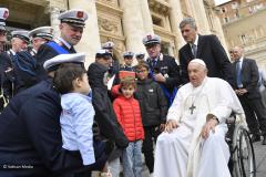 Al termine dell’udienza del mercoledì gli agenti in divisa, accompagnati dal Comandante Paolo Baldini responsabile della Struttura Unica di Polizia Municipale del Mugello e dal Comandante del Distretto di Borgo San Lorenzo Marco Bambi, sono stati ricevuti personalmente da Sua Santità gli hanno consegnato alcuni doni: un secchiello con aspergers con manico di corno, per ricordare l’arte di Scarperia, opera degli artigiani mugellani; un crocifisso in rame con base in legno di olivo a significare la pace, il crest (riproduzione dello stemma araldico del corpo) della Polizia Municipale. Il Santo Padre con grande semplicità e paternità ha salutato i figli degli uomini e delle donne in divisa soffermandosi a con il piccolo Elias, di poco più di un anno, che vestiva una camicia con i fregi della Polizia Municipale, il Santo Padre ha scherzato con il ciuccio del piccolo dicendogli che da grande sarà un grande vigile. I partecipanti all’evento, liberi dal servizio ma con l’uniforme, hanno anche effettuato una raccolta fondi da destinare alle missioni di Don Pasquale Poggiali.